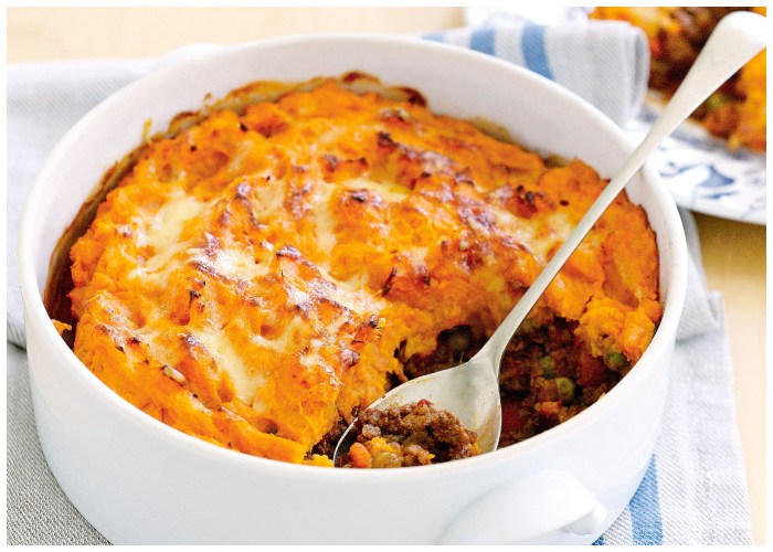 - Layer the turkey mixture in a baking dish, then spread the mashed sweet potatoes on top.